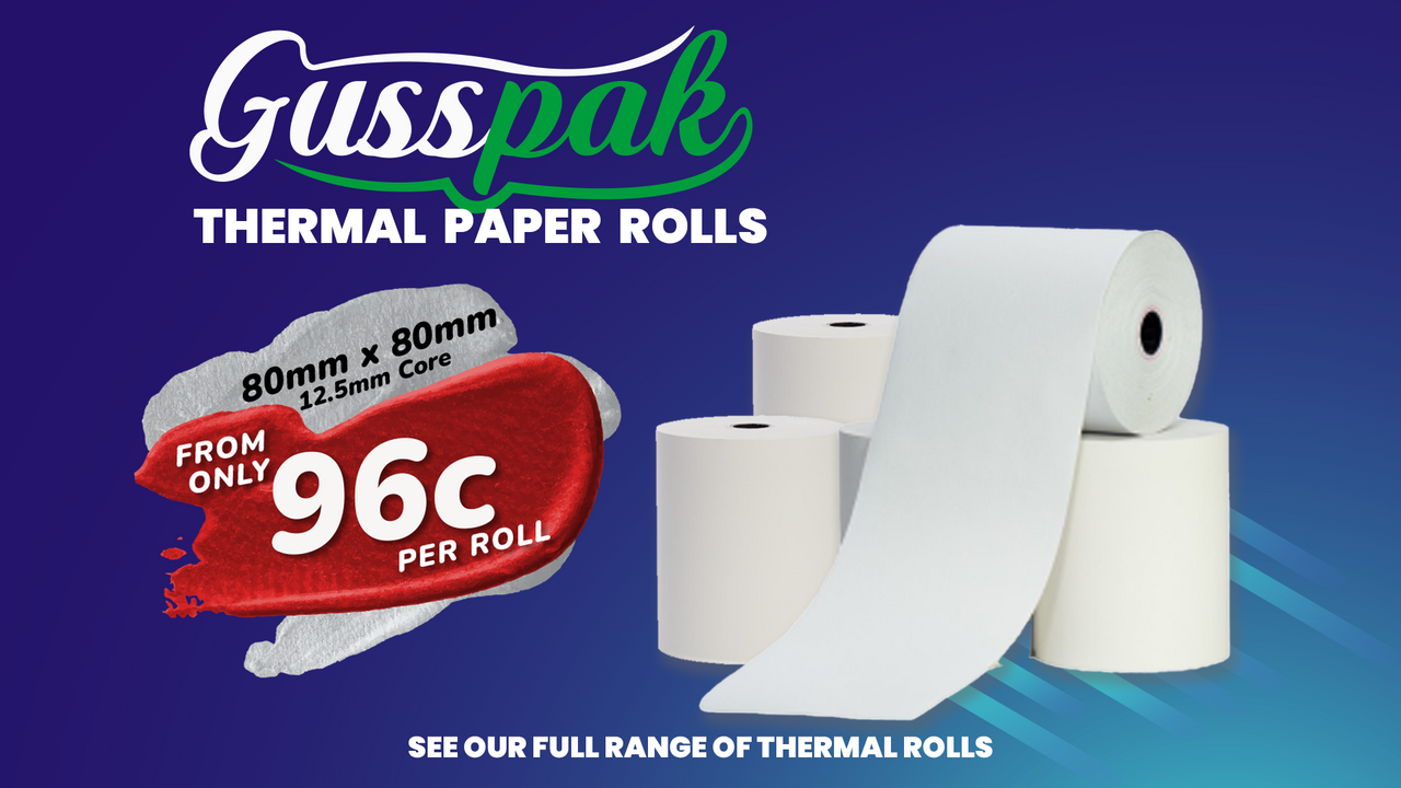 Quick view SKU: GP-TR808012 GUSSPAK THERMAL RECEIPT PAPER ROLL 80MM X 80MM 12MM CORE FSC BPA FREE MSRP Was Price Now $1.47 inc. GST $1.34 ex. GST Add to Favourites